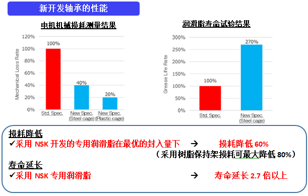 通過采用NSK開發(fā)的專用潤滑脂,對比過去的產(chǎn)品,由于軸承運轉(zhuǎn)時可以有效抑制軸承內(nèi)部的磨損,從而提高軸承的壽命(2.7倍以上)。